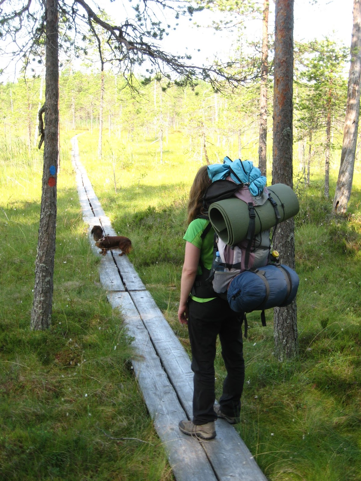 Matkalla nähtiin peuran vasa ihan läheltä. Iines ainakin haistoi, ellei jopa nähnyt sitä. Muuten Iines oli vapaana, mutta tässä kohtaa se piti laittaa hetkeksi kiinni, ettei se olisi lähtenyt vasan perään. Koko vaelluksen ajan Iines kulki kiltisti mukanamme polkuja pitkin. Toisinaan se seurasi metrin tai kaksi jotain hajujälkeä, mutta palasi viimeistään kutsusta takaisin.